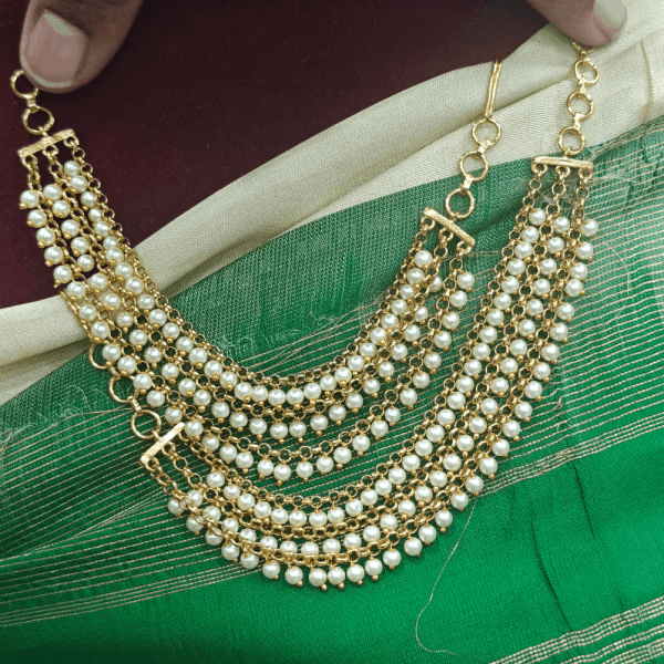 | Content | 3 line pearl earchain | Lakshmi coin ear chain | Peacock pearl ear chain | Lakshmi coin stone ear chain | Mango flower ear chain | Peacock mango pearl ear chain | ||||||||||||