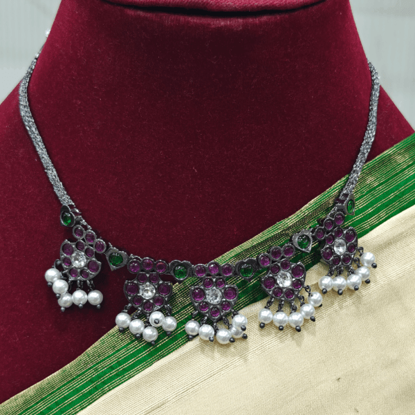 Content | 5 Betel leaf inspired real kemp black polish necklace | Maanga real kemp black polish necklace | Real kemp red stone black polish attigai | 9 Betel leaf inspired black polish necklace | Mullai real kemp necklace (Gold polish) Delivery time 15-20 days | Real kemp poo attigai (Black finish) | ||||||||||||
