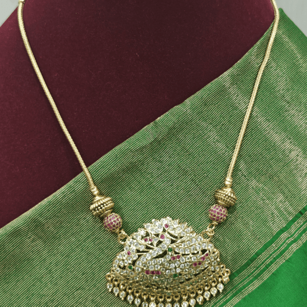 Description | Annam padhakkam ruby ball chain (Ruby green) | Peacock exclusive chain set | Peacock chain set (Mint green) | Kundan coral embellished pendant chain set | Poo traditional mangalsutra set | Kundan jadau maanga attigai set (Turquoise blue) | ||||||||||||