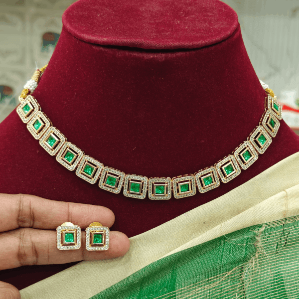 | Description | Antara rose gold necklace (Green) | Black rope maanga necklace with maanga stud | Navratna antique choker with pearls cluster | Kundan jadau maanga attigai set (Blue) | Kundan jadau maanga attigai set (Turquoise blue) | Navratna necklace | ||||||||||||