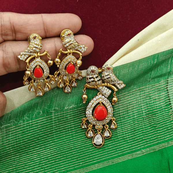 | Description | Bird coral pendant set | Bird pendant for all your trendy outfits with beautiful semi precious stones | Ganda berunda pendant set with ruby stones long chain | Lakshmi on her beautiful form seated on a lotus , grab the pendant and dazzle | Thamarai lakshmi with short chain | Exclusive stones studded perumal pendant | ||||||||||||