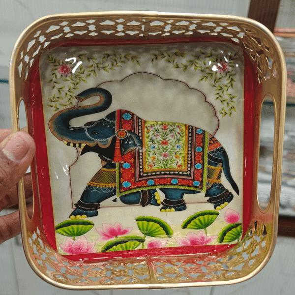 | Description | Blue pichwai 6inch tray | Pichwai kumkum box (Green) | Elephant square 6 inch tray | Pichwai kumkum box (Orange) | Pichwai kumkum box (Purple) | ||||||||||