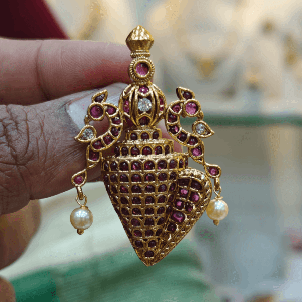 | Name | Double peacock shanku pendant remove | Mango jadau pendant set attached to black rope (black) remove | Mango jadau pendant set (Navratna) remove | Antique lakshmi pendant set remove | Gandaberunda kemp pendant set remove | Rakkodi pendant set with preethi chain remove | ||||||||||||
