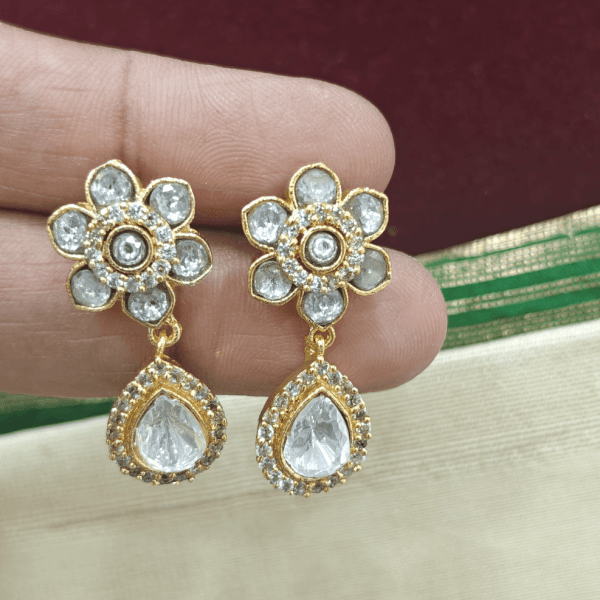 | Description | Floral jadau earrings (white) | Leaf chandbali earring | Pearl jadau antique kemp hook earrings | Floral jadau earrings (Ruby green) | Lotus peacock earrings | Peacock stud (emerald) | ||||||||||||