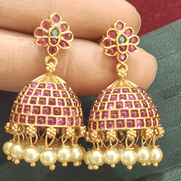 | Content | Floral jumkha | Jhumka in style with ruby and white stones | Ruby emerald pineapple jhumkha | Annam jhumkha | Peacock grand earcuff | Jhumka in style with ruby green and white stones | ||||||||||||