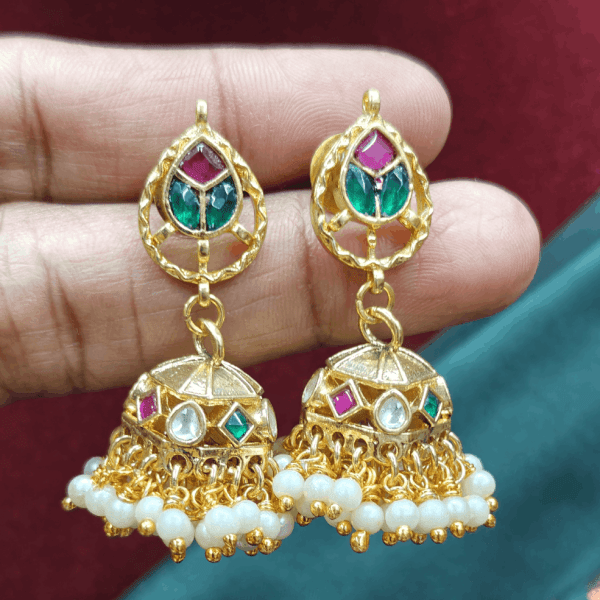 | Description | Gopuram jumkha | Ruby emerald pineapple jhumkha | Victorian polish kundan stones jhumkha | Annam jadau jhumkha (Coral) | Mango kundan jhumkha (Ruby) | Mango kundan jhumkha (Ruby green white) | ||||||||||||||