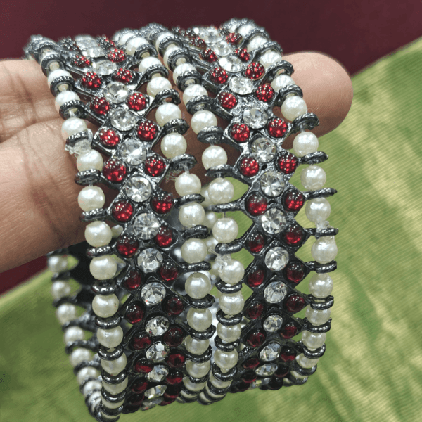 | Description | Diamond look alike bangles | Peacock bangles in pair of 2 studded with ruby , emerald and white stones | Ruby emerald pearl bangles with three lines of pearls | Ruby kemp bangles with zircon white stones | ||||||||||||||||||||||||