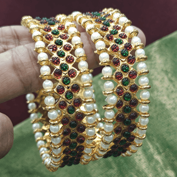 | Description | Kemp bangles (Gold polish) | Ruby emerald flower kambi bangle | Lakshmi white stone bangles | Floral ruby emerald bangles with two pearl lines | Emerald floral bangles | |||||||||||||||||||||||