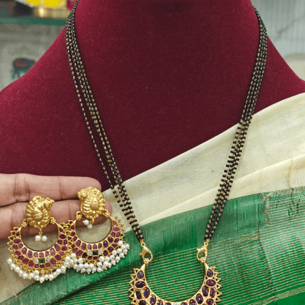 | Content | Peacock chandbali set with black beads | Rakkodi pendant set with lotus chain (Blue red combination) | Mango jadau pendant set attached to black rope (Blue) | Double peacock emerald pendant set | Mango jadau pendant set attached to black rope (Navratna) | Mayil padhakkam pendant with kemp and kundan stones | ||||||||||||