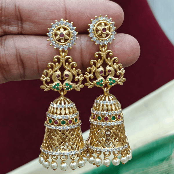 DescriptionPeacock light weight bell jhumkhakundan mini jhumkhasRuby emerald pineapple jhumkhaAnnam jadau jhumkha (Coral)Ruby with pearl balls spring jhumkhaAnnam jadau jhumkha (Kundan white)