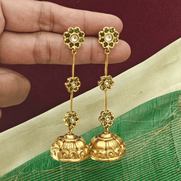 | Name | Pearl jadau antique kemp hook earrings remove | Chakra stud (emerald) remove | Flower ruby earring remove | Chakra stud (ruby) remove | Preethi lightweight long kemp jhumkha (Green white) remove | Leaf stud (ruby) remove | ||||||||||||
