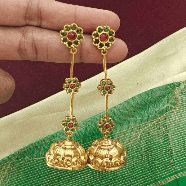 | Content | Preethi lightweight long kemp jhumkha (Green red) | Annam jadau jhumkha (Bottle) | Lotus green jumkha | Peacock ileana jhumkha(Ruby) | Jhumka in style with ruby green and white stones | Victorian polish kundan stones jhumkha | ||||||||||||