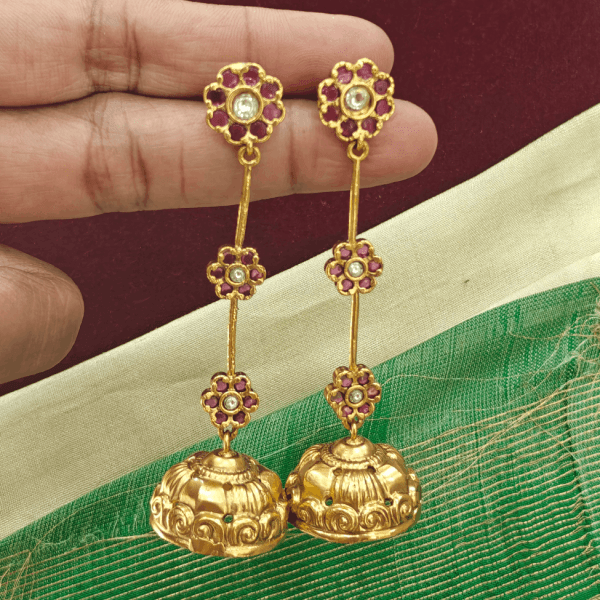 | Content | Preethi lightweight long kemp jhumkha (Ruby white) | Jhumka in style with ruby and white stones | Amirtham mini kundan jhumkhas (Green red) | Annam jhumkha | kundan mini jhumkhas | Annam jadau jhumkha (Bottle) | ||||||||||||