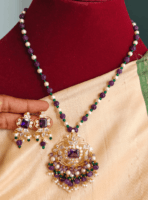 | Description | Purple pumpkin beads mossainaite set | Amirtham mini kundan jhumkhas (White green) | Maanga kundan jadau pendant set with black rope | Maanga kundan necklace (White) | Amirtham attigai necklace with jadau stones in green and red stones | Amirtham mini kundan jhumkhas (Green red) | ||||||||||||