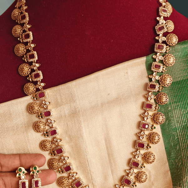 ContentRam parivar ruby haaramLakshmi netted pearl haaram with jhumkhasPadhakkam haaram with green beads gold balls chainMani muthu haaram with exclusive american diamond stonesAmerican diamond stones haaramNritya kemp haaram with jhumkha (Red) Length: 30 inches
