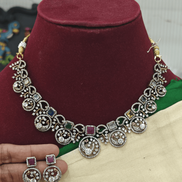 Description | Victorian peacock multicolor necklace | Diamond cut necklace with dangler earrings | Krishna antique chain pendant set | Antique bridal lakshmi necklace set with jhumkha | Antique lakshmi pendant attached to a beautiful murukku chain | |||||||||||||